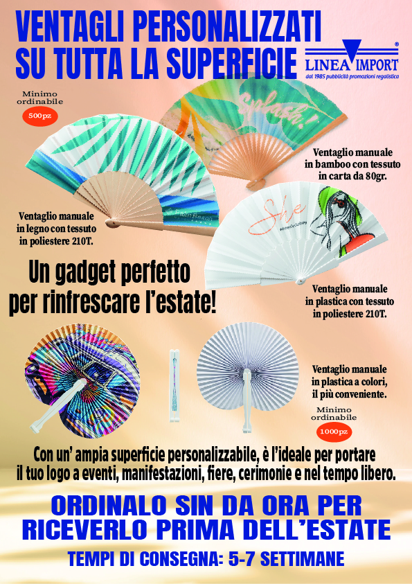 Un gadget perfetto per rinfrescare l'estate! Con un'ampia superficie personalizzabile, è ideale per portare il tuo logo a eventi, manifestazioni, fiere, cerimonie e nel tempo libero.